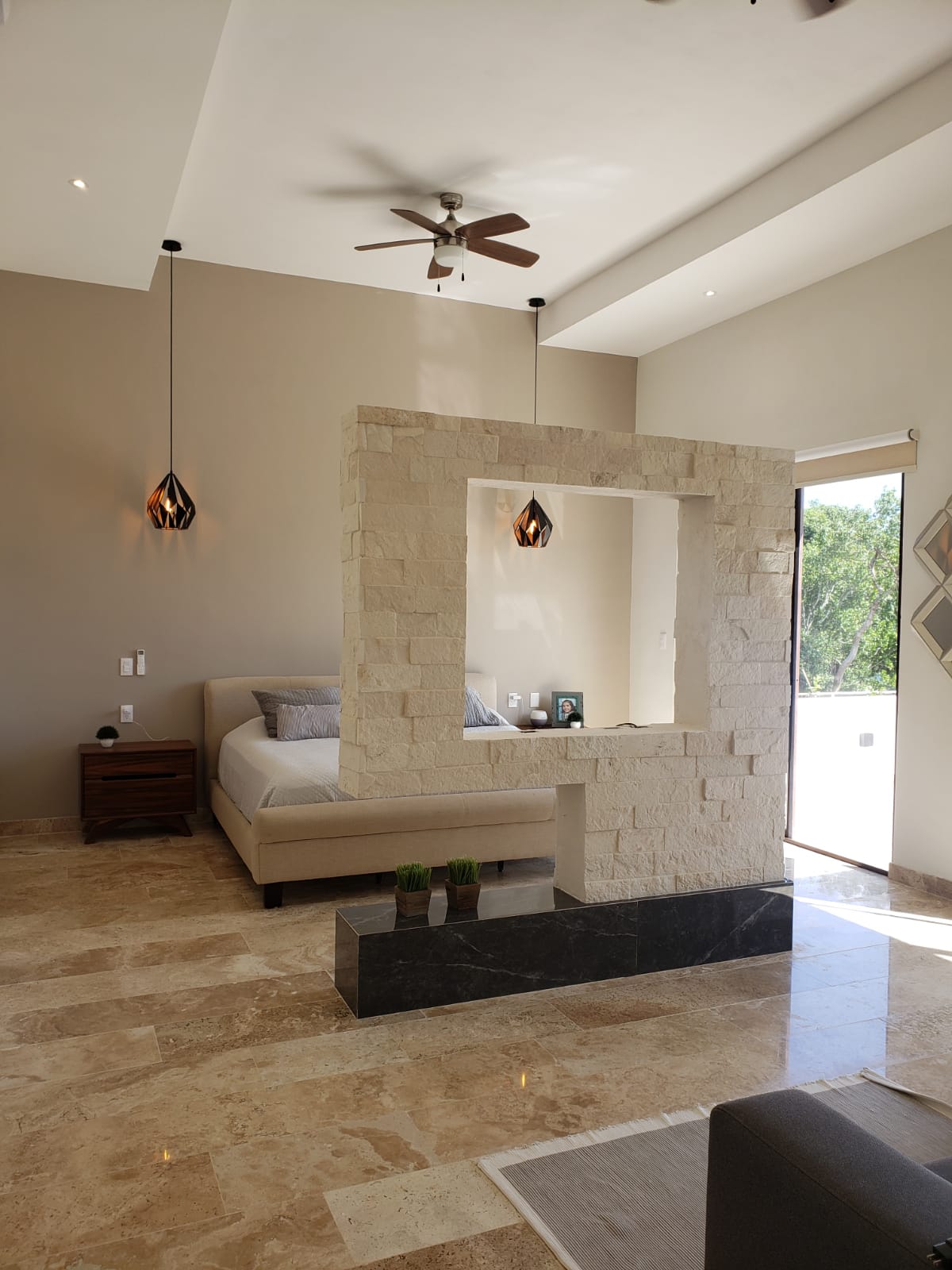 Recámara principal con sala de tv y terraza, baño completo con walk in closet .